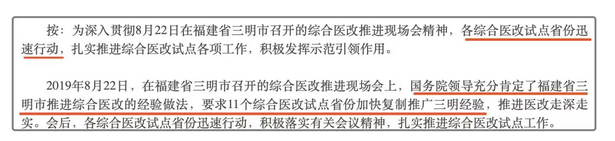 此前,在福建省三明市召開的綜合醫(yī)改推進(jìn)現(xiàn)場會上,國務(wù)院領(lǐng)導(dǎo)充分肯定了福建省三明市推進(jìn)綜合醫(yī)改的經(jīng)驗(yàn)做法,要求11個綜合醫(yī)改試點(diǎn)省份加快復(fù)制推廣三明經(jīng)驗(yàn),推進(jìn)醫(yī)改走深走實(shí)。