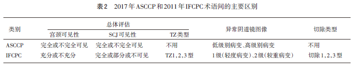 2.1.4 標(biāo)準(zhǔn)化ASCCP術(shù)語(yǔ)的最終類別包括其他發(fā)現(xiàn)和陰道鏡印象 因?yàn)殛幍犁R檢查中發(fā)現(xiàn)多處病變并不罕見(jiàn),陰道鏡總體印象應(yīng)為最高級(jí)病變。美國(guó)標(biāo)準(zhǔn)化陰道鏡實(shí)踐的描述性術(shù)語(yǔ)見(jiàn)表1。 2011年IFCPC術(shù)語(yǔ)被用作ASCCP術(shù)語(yǔ)推薦的模板,二者的區(qū)別見(jiàn)表2。