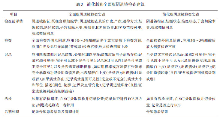 ASCCP此次發(fā)布的簡(jiǎn)化版和全面版陰道鏡檢查的程序建議,提出以下6項(xiàng)主要內(nèi)容:術(shù)前評(píng)估、陰道鏡檢查、輔助物的使用、結(jié)果記錄、活檢取樣和術(shù)后常規(guī)(見(jiàn)表3)。推薦的簡(jiǎn)化版陰道鏡檢查,其術(shù)前評(píng)估要點(diǎn)包括患者陰道鏡檢查指征、妊娠狀態(tài)、是否絕經(jīng)、子宮切除術(shù)史及簽署知情同意書(shū)。而全面版陰道鏡檢查,除了簡(jiǎn)化版的內(nèi)容要求外,還有一些推薦的要點(diǎn):患者既往宮頸細(xì)胞學(xué)結(jié)果、陰道鏡檢查結(jié)果、宮頸病變治療史、產(chǎn)次、避孕方式、吸煙史、HIV感染情況和HPV疫苗接種情況等。在簡(jiǎn)化版的陰道鏡檢查中,術(shù)者需先檢查患者的外陰和陰道,然后再給宮頸涂抹3%~5%醋酸后放大觀察宮頸情況。而全面的陰道鏡檢查則強(qiáng)調(diào)還需放大觀察陰道上段,然后在宮頸涂抹3%~5%醋酸后,使用多倍放大鏡,白光及(藍(lán)或綠)濾鏡檢查宮頸。簡(jiǎn)化版陰道鏡檢查僅需用文字記錄結(jié)果,而全面的陰道鏡檢查還需使用圖表、照片,盡量在病變部位做標(biāo)注,并將結(jié)果導(dǎo)入電子病歷中。需要強(qiáng)調(diào)的是,不論是簡(jiǎn)化版還是全面版,SCJ的可見(jiàn)性,是否有醋酸白改變以及病灶情況均需詳細(xì)記錄。每一個(gè)陰道鏡檢查都要記錄陰道鏡評(píng)估印象(正常/良性或LSIL或HSIL或癌)。此外,全面版還需記錄是否需要特殊處理才能使SCJ完全可見(jiàn);若有病灶,需記錄其可見(jiàn)情況(完全或不完全),病灶的大小,位置和描述其特征(顏色,形狀,邊界,血管改變)。若需活檢,簡(jiǎn)化版和全面版都強(qiáng)調(diào)應(yīng)在SCJ取樣,并記錄是否行ECS。全面版需記錄活檢位置,如行ECS,還需記錄其方式。最后,所有術(shù)者均應(yīng)告知患者病變活檢及ECS的結(jié)果,以及后續(xù)的治療計(jì)劃。