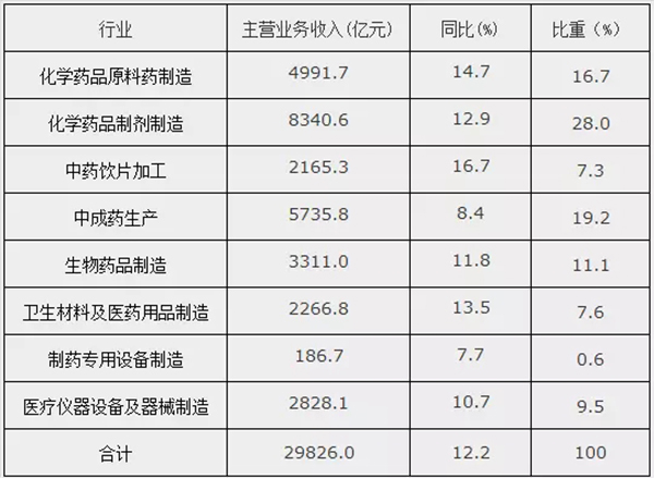 2017年,規(guī)模以上醫(yī)藥企業(yè)主營(yíng)業(yè)務(wù)收入29826.0億元,同比增長(zhǎng)12.2%,增速較2016年提高2.3個(gè)百分點(diǎn),恢復(fù)至兩位數(shù)增長(zhǎng)。8個(gè)子行業(yè)主營(yíng)業(yè)務(wù)收入增長(zhǎng)情況如下表,其中增長(zhǎng)最快的是中藥飲片加工業(yè)和化學(xué)藥品原料藥制造業(yè)。