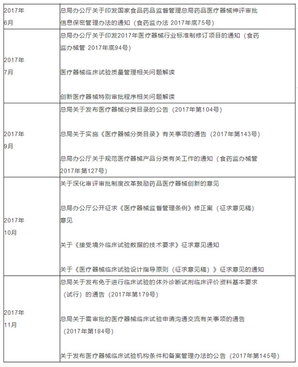 截止到2017年11月底,共發(fā)布醫(yī)療器械相關的公告超過20個,尤其是10月8日頒布《關于深化審評審批制度改革鼓勵藥品醫(yī)療器械創(chuàng)新的意見》后,為貫徹落實新規(guī),繼續(xù)發(fā)布了6份相關的征求意見稿和3個決定,涉及境外臨床試驗數(shù)據(jù)、審評審批效率、鼓勵創(chuàng)新等多個方面。