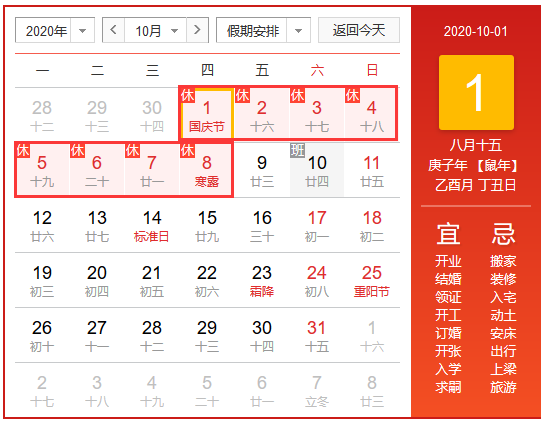 2020年北京華康普美科技有限公司,中秋節(jié)&國(guó)慶節(jié)假期為:10月1日-10月8日放假調(diào)休,共8天,9月27日(星期日)、10月10日(星期六)上班。