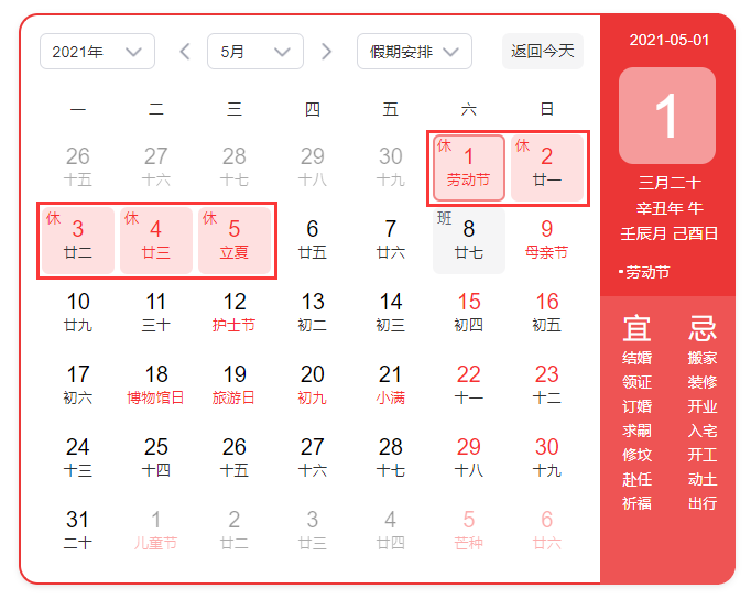 2021年北京華康普美科技有限公司,“五一勞動節(jié)”假期為:5月1日-5月5日放假調(diào)休,共5天。 4月25日(星期日)、5月8日(星期六)上班。