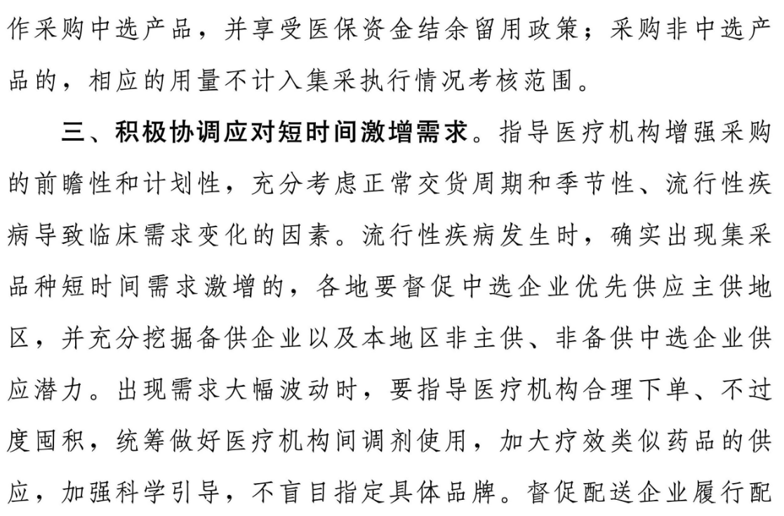 《通知》指出,各級(jí)醫(yī)保部門要強(qiáng)化供需對(duì)接,建立醫(yī)療機(jī)構(gòu)與中選企業(yè)線上溝通協(xié)調(diào)機(jī)制,暢通供應(yīng)問(wèn)題反饋收集渠道。鼓勵(lì)醫(yī)療機(jī)構(gòu)主動(dòng)向醫(yī)保部門書面反饋中選產(chǎn)品供應(yīng)問(wèn)題,經(jīng)核實(shí)后,該醫(yī)療機(jī)構(gòu)采購(gòu)備供企業(yè)產(chǎn)品可直接視作采購(gòu)中選產(chǎn)品,并享受醫(yī)保資金結(jié)余留用政策,采購(gòu)非中選產(chǎn)品的,相應(yīng)的用量不計(jì)入集采執(zhí)行情況考核范圍。