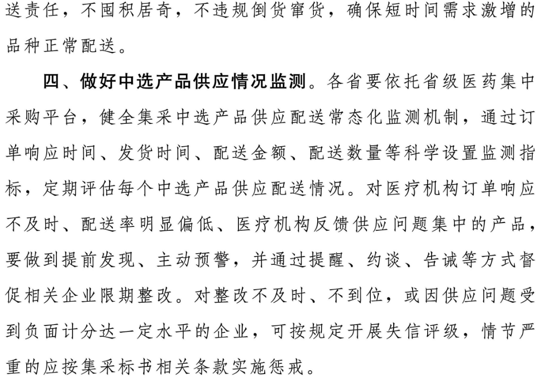 對(duì)整改不及時(shí)、不到位,或因供應(yīng)問(wèn)題受到負(fù)面計(jì)分達(dá)一定水平的企業(yè),可按規(guī)定開展失信評(píng)級(jí),情節(jié)嚴(yán)重的應(yīng)按集采標(biāo)書相關(guān)條款實(shí)施懲戒。