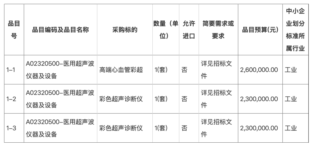 其中,項(xiàng)目一(高端心血管彩超、彩色超聲診斷儀)預(yù)算金額720萬(wàn)元,最高限價(jià)564萬(wàn)元;項(xiàng)目二(醫(yī)用超聲波儀器及設(shè)備)預(yù)算金額715萬(wàn)元,最高限價(jià)531萬(wàn)元;項(xiàng)目三(醫(yī)用內(nèi)窺鏡)預(yù)算金額840萬(wàn)元,最高限價(jià)580萬(wàn)元。
