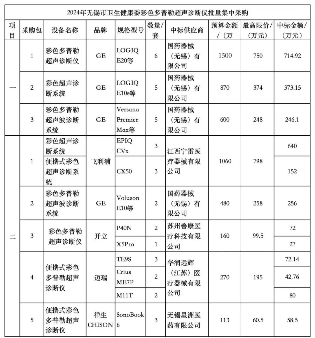 同在本周,2024年江蘇省無(wú)錫市衛(wèi)生健康委彩色多普勒超聲診斷儀批量集中采購(gòu)項(xiàng)目中標(biāo)結(jié)果公布。