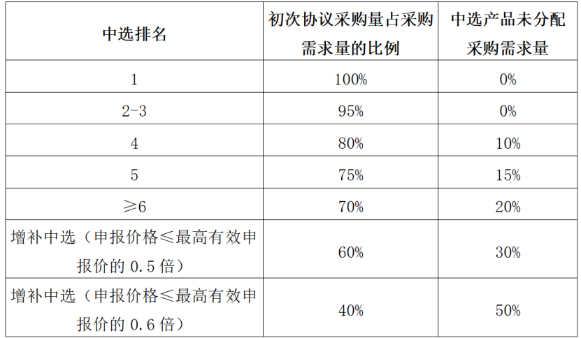 第一步:按中選排名確定初次協(xié)議采購量,初次協(xié)議采購量占采購需求的比例見下表。根據(jù)醫(yī)療機構的采購需求量,四舍五入取整,計算各品種各企業(yè)的初次協(xié)議采購量。
