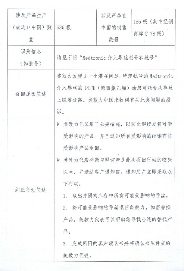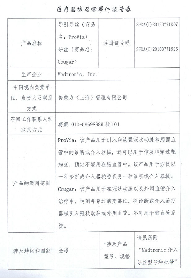 根據(jù)2013年12月2日上海市食品藥品監(jiān)督管理局的報告,由于PTFE(聚四氟乙烯)涂層可能會從導(dǎo)絲上脫落分離等原因,Medtronic,Inc.公司對其生產(chǎn)的導(dǎo)引導(dǎo)絲(注冊號:國食藥監(jiān)械(進(jìn))字2013第3771007號)、導(dǎo)絲(注冊號:國食藥監(jiān)械(進(jìn))字2010第3771926號)進(jìn)行主動召回。請各省、自治區(qū)、直轄市食品藥品監(jiān)督管理局加強(qiáng)對此類產(chǎn)品的監(jiān)督管理。