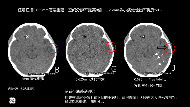 北京兒童醫(yī)院的測試病例也顯示,經(jīng)過TrueFidelity,任意掃描0.625mm薄層重建,空間分辨率能提高8倍,1.25mm微小病灶檢出率提升50%,最終額外發(fā)現(xiàn)了3個之前看不到的微小病灶。