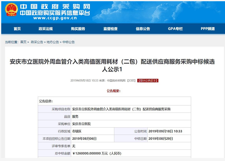 9月18日中國(guó)政府采購(gòu)網(wǎng)發(fā)布《安慶市立醫(yī)院外周血管介入類高值醫(yī)用耗材(二包)配送供應(yīng)商服務(wù)采購(gòu)中標(biāo)候選人公示1》。