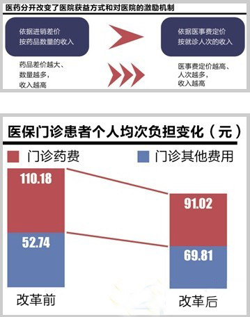 在試點(diǎn)醫(yī)院的改革中,患者首先得到了益處。評(píng)估報(bào)告對(duì)此給出了數(shù)據(jù)結(jié)論,即改革后,試點(diǎn)醫(yī)院患者次均藥費(fèi)下降明顯,同比下降幅度達(dá)到了26.3%。即使剔除15%的取消藥品加成因素,仍有13%以上的費(fèi)用降幅。更為重要的是,患者用藥的合理性得到了提高。