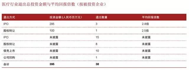 報(bào)告顯示,醫(yī)療健康企業(yè)的投資退出方式主要為上市和股權(quán)轉(zhuǎn)讓,披露金額項(xiàng)目的平均投資回報(bào)率在2至8倍之間,上市板塊主要集中在香港主板和新三板。