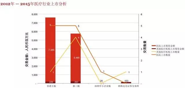 醫(yī)療健康企業(yè)的投資退出方式主要為上市和股權(quán)轉(zhuǎn)讓,披露金額項(xiàng)目的平均投資回報(bào)率在2至8倍之間。根據(jù)統(tǒng)計(jì),2012年至2015年間,共計(jì)有17家醫(yī)療健康行業(yè)企業(yè)成功上市,總計(jì)籌資人民幣127.7億元,上市板塊主要集中在香港主板和新三板。