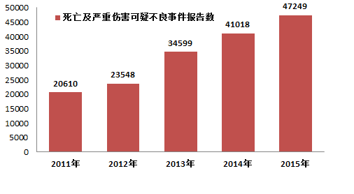 圖1-2 2011-2015年全國死亡及嚴重傷害可疑不良事件報告數(shù)比較