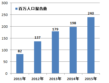 圖1-3 2011-2015年全國每百萬人口平均報告數(shù)比較