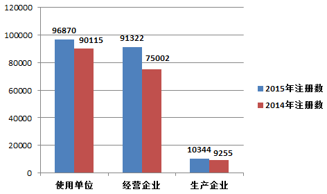 2015年,注冊基層用戶(包括醫(yī)療器械生產(chǎn)企業(yè)、經(jīng)營企業(yè)和使用單位)總數(shù)比2014年增長了13.9%。其中,醫(yī)療器械生產(chǎn)企業(yè)、經(jīng)營企業(yè)和使用單位的注冊基層用戶分別比2014年增長了11.8%、21.8%和7.5%(圖1-5)。