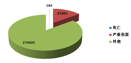 2015年,全國上報的可疑醫(yī)療器械不良事件報告中,事件傷害為死亡的報告共184份,占總報告數(shù)的0.05%;事件為嚴重傷害的報告共 47,065份,占總報告數(shù)的14.7%;事件傷害為其他的報告共274,005份,占總報告數(shù)的85.2%(圖2-2)。2015年,各類傷害程度的報告絕對數(shù)量均有所增加,其所占比例與2014年相似。