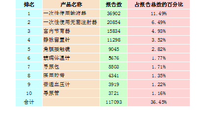 表2-2 報告數(shù)量排名前十位的無源醫(yī)療器械