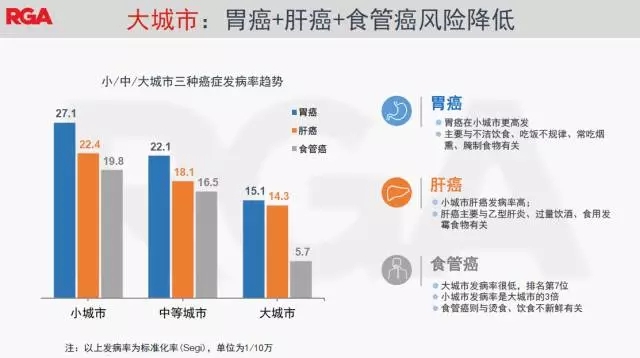 隨著城市化提高,也有部分癌癥發(fā)病率降低,主要體現(xiàn)在胃癌/肝癌/食管癌;