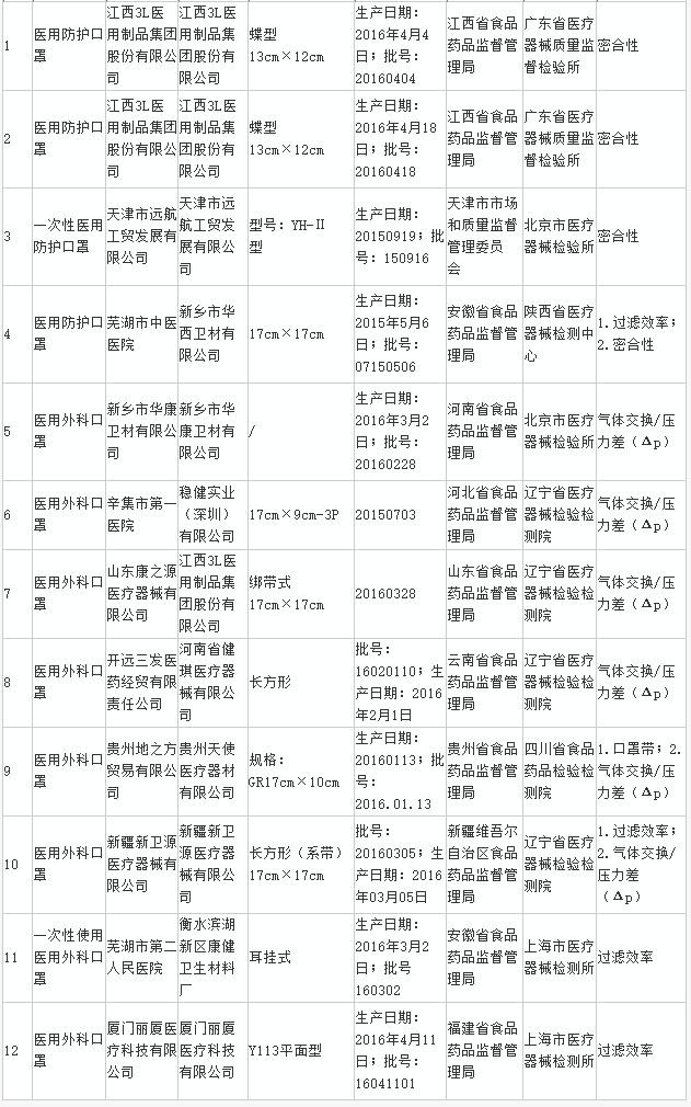 (一)醫(yī)用防護(hù)口罩3家企業(yè)4批產(chǎn)品。江西3L醫(yī)用制品集團(tuán)股份有限公司生產(chǎn)的2批醫(yī)用防護(hù)口罩、天津市遠(yuǎn)航工貿(mào)發(fā)展有限公司生產(chǎn)的1批一次性醫(yī)用防護(hù)口罩,密合性不符合標(biāo)準(zhǔn)規(guī)定;新鄉(xiāng)市華西衛(wèi)材有限公司生產(chǎn)的1批醫(yī)用防護(hù)口罩,過濾效率、密合性不符合標(biāo)準(zhǔn)規(guī)定。