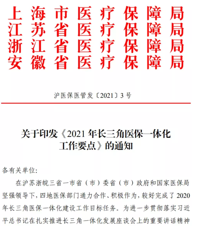 醫(yī)藥網(wǎng)3月17日訊 近日,一份名為《2021年長(zhǎng)三角醫(yī)保一體化工作要點(diǎn)》的通知在業(yè)內(nèi)流傳。文件顯示由上海、江蘇、浙江、安徽三省一市的醫(yī)保局聯(lián)合發(fā)布。