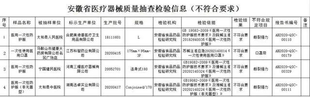 其中,在太和縣人民醫(yī)院抽樣的,標(biāo)示為合肥美迪普醫(yī)療衛(wèi)生用品有限公司生產(chǎn)的醫(yī)用一次性防護(hù)服,生產(chǎn)批號(hào)18111601,規(guī)格L;寧國(guó)健民醫(yī)院抽樣的,標(biāo)示為河南三耀醫(yī)療器械有限公司生產(chǎn)的醫(yī)用一次性防護(hù)服,生產(chǎn)批號(hào)20052701,規(guī)格連身式180;太和縣中醫(yī)院抽樣的,標(biāo)示為湖南迅卓實(shí)業(yè)有限公司生產(chǎn)的醫(yī)用一次性防護(hù)服(非無菌型),生產(chǎn)批號(hào)20200417,規(guī)格Conjoined/170;均斷裂強(qiáng)力不符合要求。