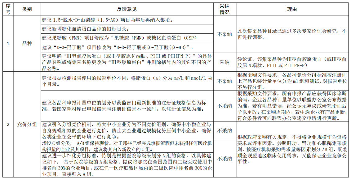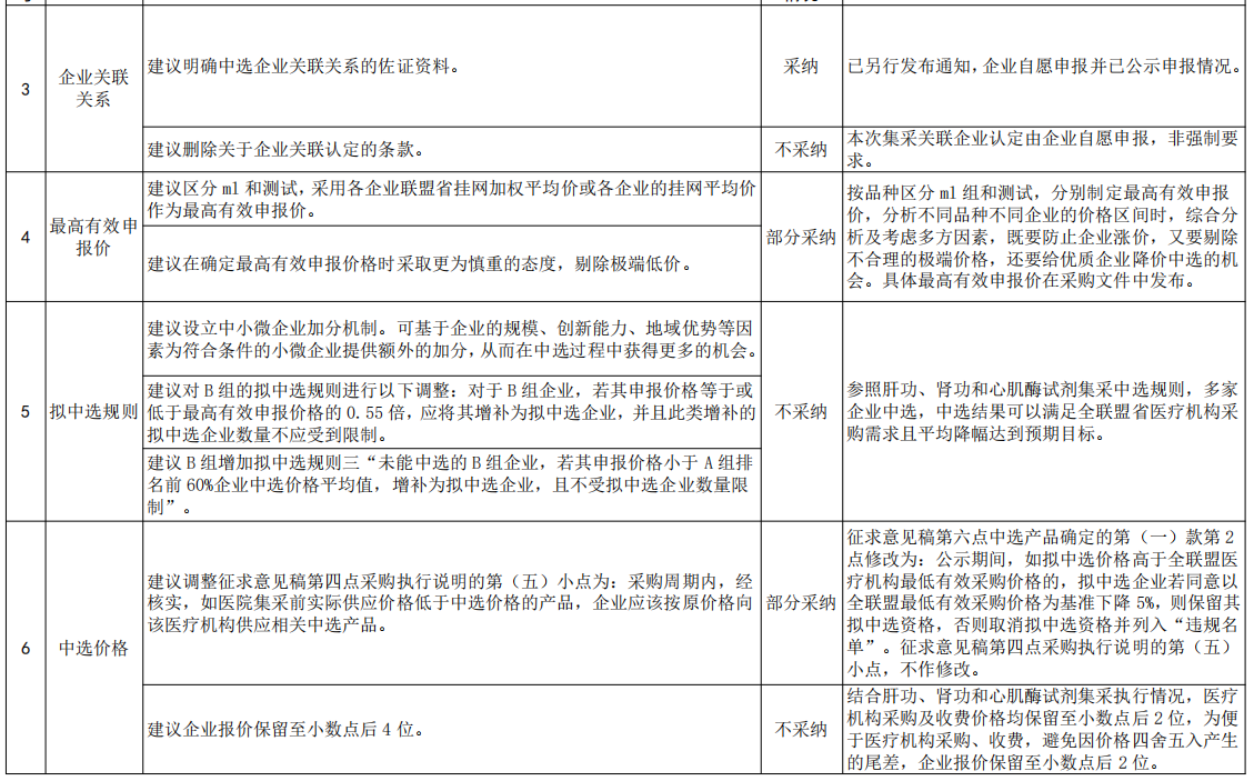 同時,在擬中選規(guī)則中“設(shè)立中小微企業(yè)加分機(jī)制”“B組低價增補(bǔ)”等建議也均被駁回,官方回應(yīng)的理由為:參照肝功、腎功和心肌酶試劑集采中選規(guī)則,多家企業(yè)中選,中選結(jié)果可以滿足全聯(lián)盟省醫(yī)療機(jī)構(gòu)采購需求且平均降幅達(dá)到預(yù)期目標(biāo)。