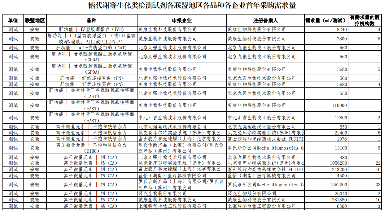 通過梳理此次公告中披露的“各地各品種各企業(yè)首年采購需求量明細(xì)“可見,邁瑞生物、安圖生物、中元匯吉生物、九強(qiáng)生物、邁克生物、美康生物、新產(chǎn)業(yè)、沃文特生物等本土企業(yè)在各個品種均獲得高額需求量占比,這預(yù)示著本輪集采的競價將較為激烈,最終的降幅或比較可觀。