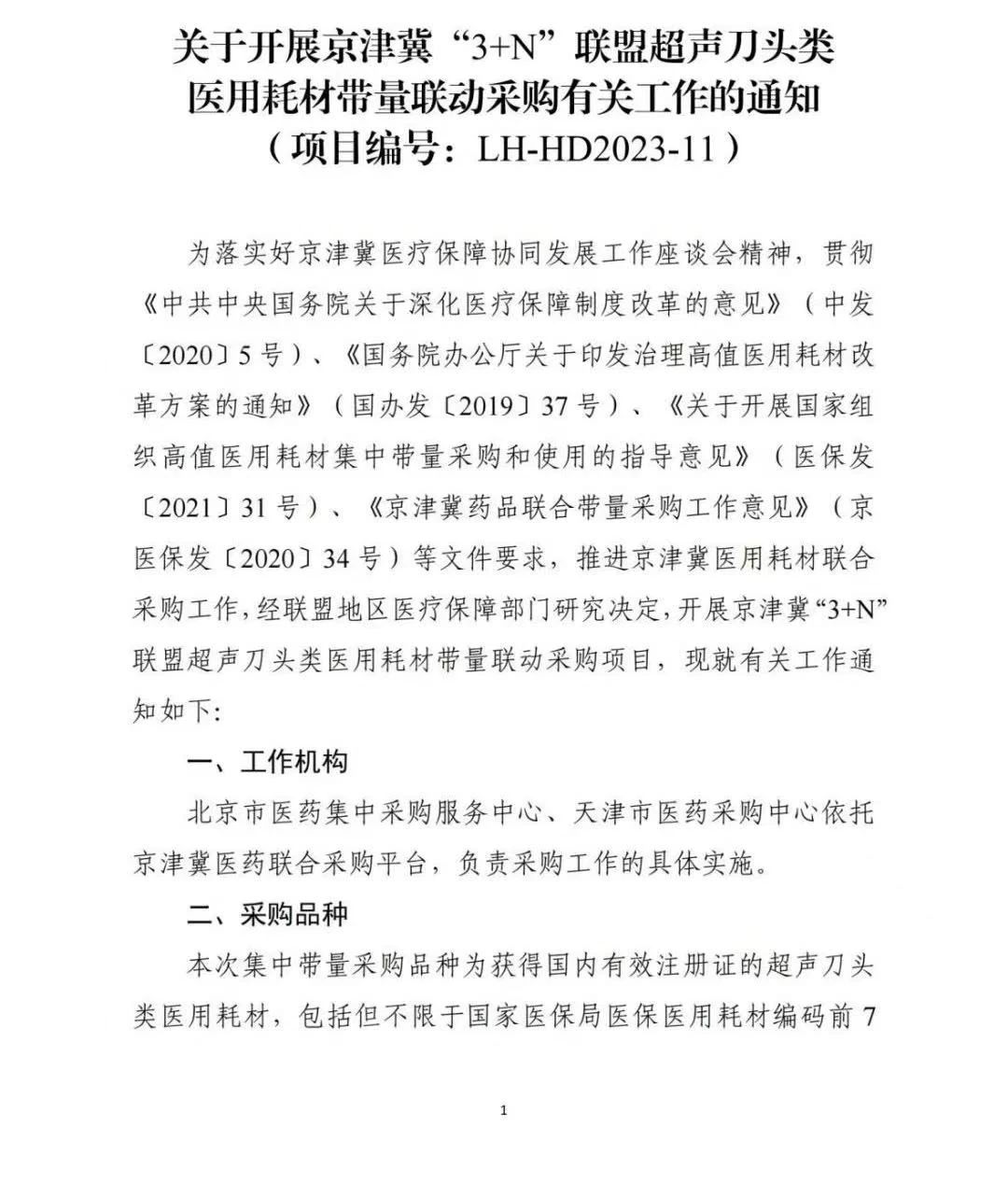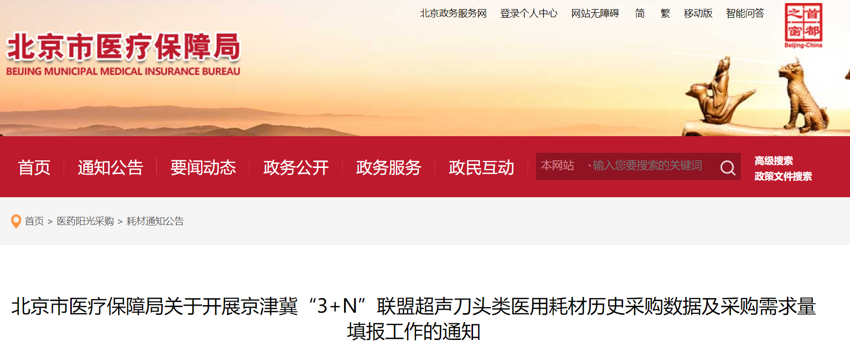 9月18日,北京醫(yī)保局發(fā)布《關(guān)于開(kāi)展京津冀“3+N”聯(lián)盟超聲刀頭類(lèi)醫(yī)用耗材歷史采購(gòu)數(shù)據(jù)及采購(gòu)需求量填報(bào)工作的通知》(簡(jiǎn)稱(chēng)《通知》)。