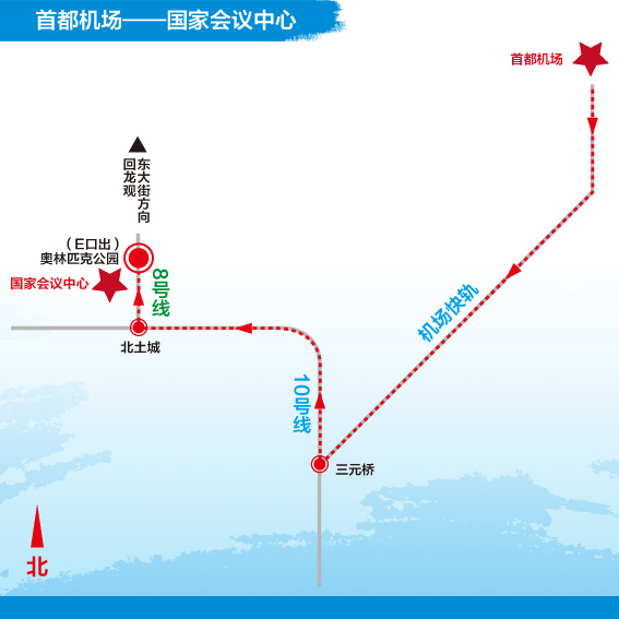 乘車線路:乘機場大巴至西單民航大廈下車,向西步行約250米換乘地鐵1號線,至東單站換乘地鐵5號線(天通苑北方向),至惠新西街南口站下,換乘地鐵10號線(巴溝方向)至北土城站下,再乘地鐵8號線(回龍觀東大街方向),在奧林匹克公園下車(E口出)。