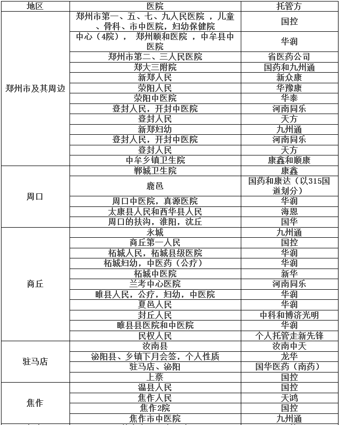 事實(shí)上,九州通、華潤(rùn)醫(yī)藥、國(guó)藥等藥事巨頭近年來高歌猛進(jìn)的藥房托管已經(jīng)為今天的耗材集采和托管服務(wù)埋下了深厚的伏筆——本質(zhì)是大規(guī)模并購后的醫(yī)藥物流服務(wù)延伸入院的頂層利益格局的滲透。下面是河南省在2015年的藥事(含部分耗材)供應(yīng)托管統(tǒng)計(jì)表,有興趣的同仁可以深度了解一下: