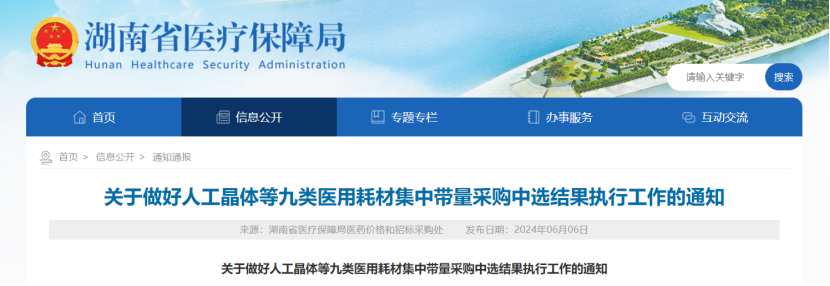6月6日,湖南省醫(yī)保局發(fā)布《關(guān)于做好人工晶體等九類(lèi)醫(yī)用耗材集中帶量采購(gòu)中選結(jié)果執(zhí)行工作的通知》,自2024年7月1日起執(zhí)行人工晶體、運(yùn)動(dòng)醫(yī)學(xué)、硬腦(脊)膜補(bǔ)片、疝修補(bǔ)材料、通用介入、神經(jīng)外科、血液透析、冠脈血管內(nèi)超聲診斷導(dǎo)管和輸注泵等九類(lèi)醫(yī)用耗材集中帶量采購(gòu)中選結(jié)果。