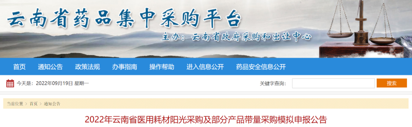 近日,云南省醫(yī)藥集中采購(gòu)平臺(tái)發(fā)布《2022年云南省醫(yī)用耗材陽(yáng)光采購(gòu)及部分產(chǎn)品帶量采購(gòu)模擬申報(bào)公告》,擬開(kāi)展2022年云南省醫(yī)用耗材陽(yáng)光采購(gòu)及部分產(chǎn)品帶量采購(gòu)的申報(bào)工作,并組織模擬申報(bào)。