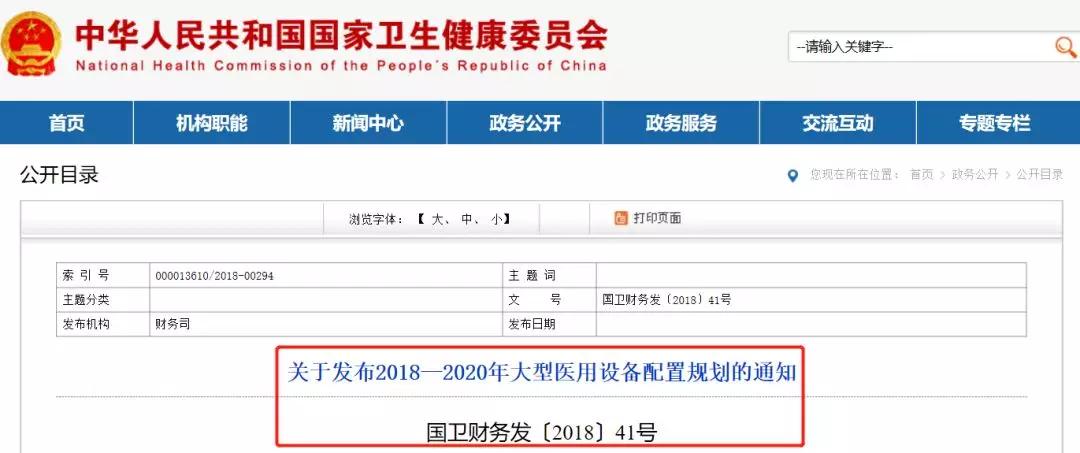 昨晚(10月29日晚),國(guó)家衛(wèi)生健康委員會(huì)官網(wǎng)掛出重大通知,名稱為《關(guān)于發(fā)布2018—2020年大型醫(yī)用設(shè)備配置規(guī)劃的通知》(下稱《規(guī)劃》),意味著關(guān)于未來(lái)三年內(nèi)大型醫(yī)用設(shè)備的配置規(guī)劃正式出爐。