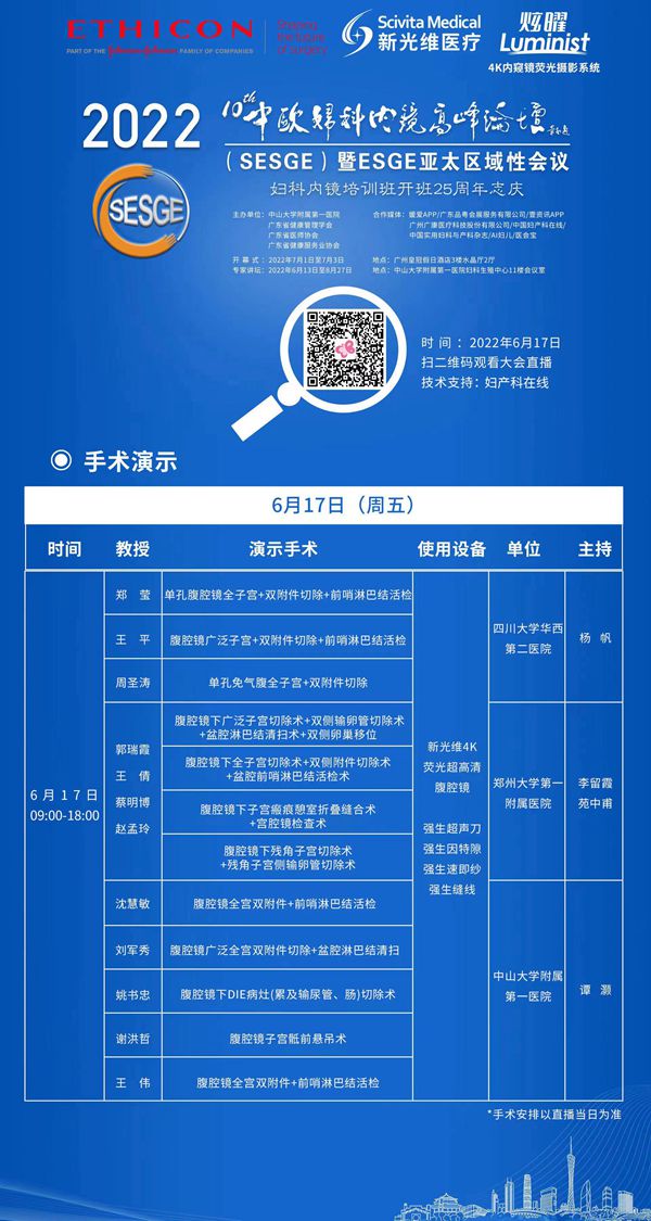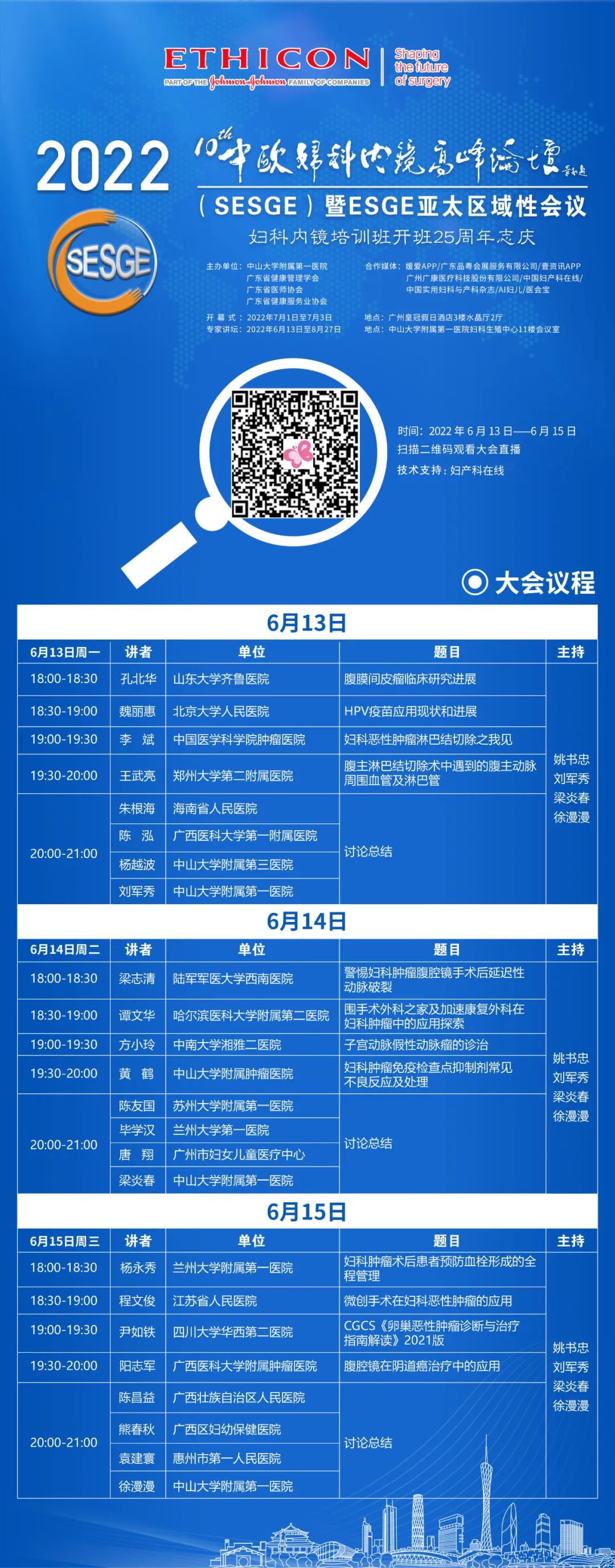 為更好地推動婦科微創(chuàng)手術的發(fā)展,促進業(yè)界深入廣泛交流,由中山大學附屬第一醫(yī)院主辦的“第十屆中歐婦科內鏡高峰論壇(SESGE)”定于2022年6月13日至8月27日召開,由于受新冠肺炎疫情影響,本次會議采用線上線下相結合的方式舉辦。