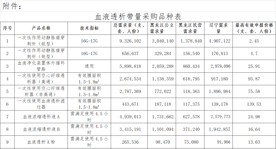 具體帶量采購品種包括:一次性作用動靜脈瘺穿刺針(銳型)、一次性作用動靜脈瘺穿刺針(鈍型)、血液凈化裝置體外循環(huán)管路、一次性使用空心纖維透析器(高通)、一次性使用空心纖維透析器(非高通)、一次性使用血液透析濾過器、血液濃縮透析液A、血液濃縮透析液B、血液透析A粉、血液透析B粉、血液透析B干粉(掛機)。