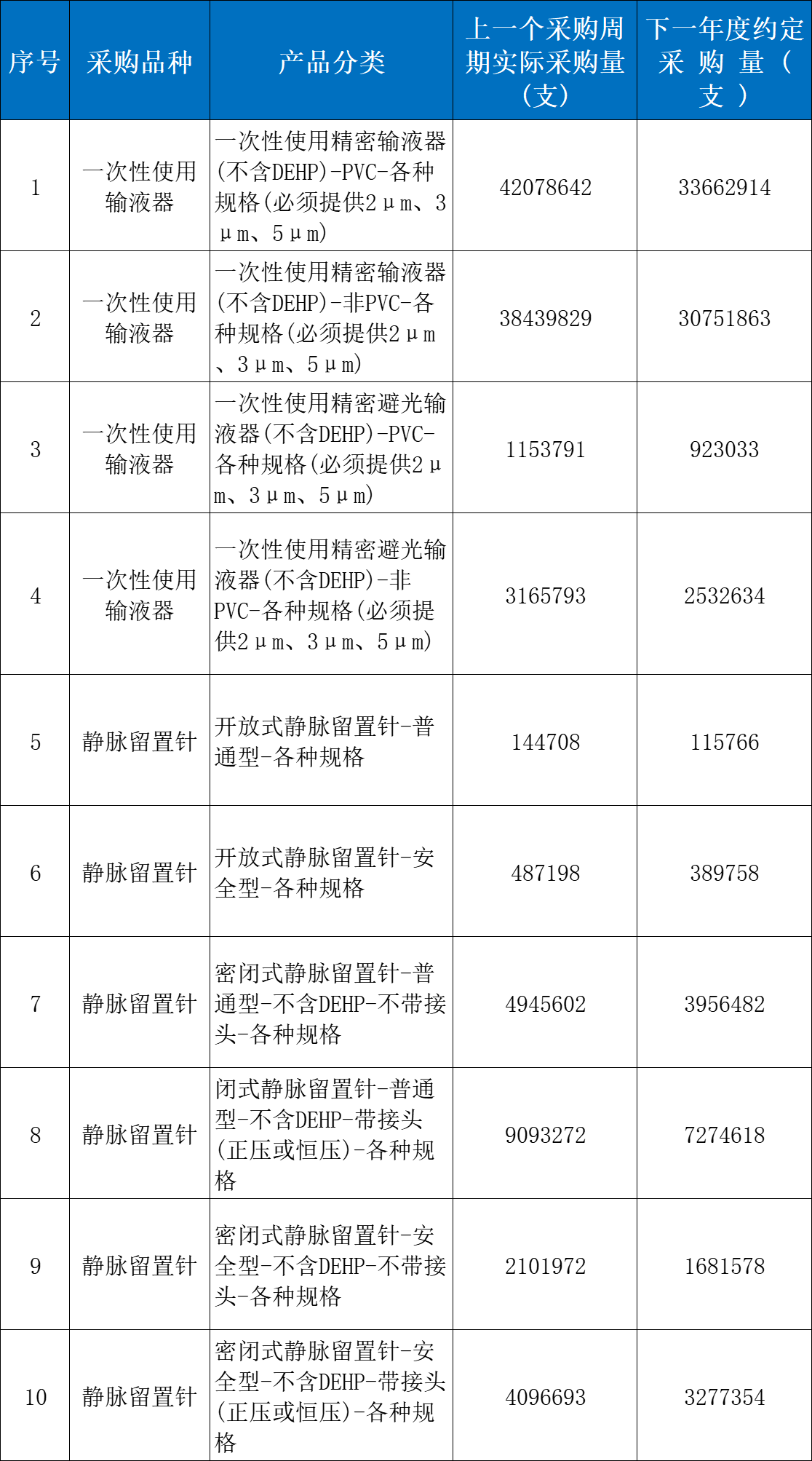 本次續(xù)約品種為一次性使用輸液器和靜脈留置針類,采購周期為兩年,參照醫(yī)療機(jī)構(gòu)的實(shí)際使用量,下一年度約定采購量不少于上一個(gè)采購周期采購量的80%。