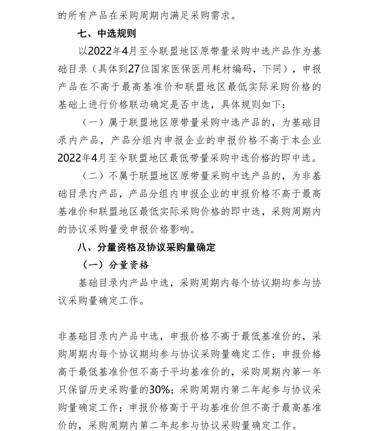 以2022年4月至今聯(lián)盟地區(qū)原帶量采購中選產(chǎn)品作為基礎(chǔ)目錄(具體到27位國家醫(yī)保醫(yī)用耗材編碼,申報產(chǎn)品在不高于最高基準(zhǔn)價和聯(lián)盟地區(qū)最低實際采購價格的基礎(chǔ)上進(jìn)行價格聯(lián)動確定是否中選,具體規(guī)則如下: