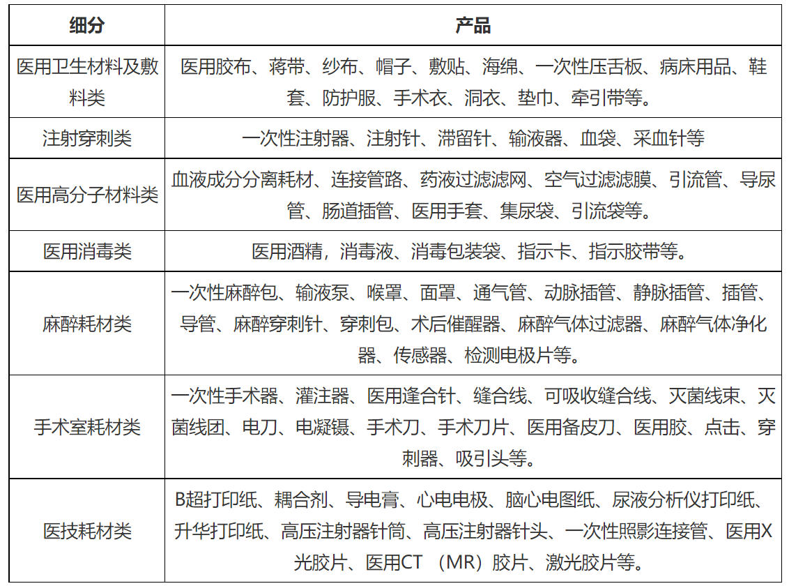 低值醫(yī)用耗材主要是指醫(yī)療服務(wù)過程中經(jīng)常使用的一次性衛(wèi)生材料,可分為醫(yī)用衛(wèi)生材料及敷料類、注射穿刺類、醫(yī)用高分子材料類、醫(yī)用消毒類、麻醉耗材類、手術(shù)室耗材類和醫(yī)技耗材類。