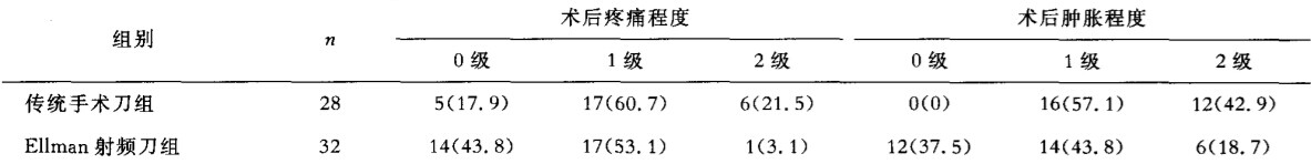 與傳統(tǒng)手術(shù)刀組患者比較,應(yīng)用Ellman射頻刀組患者術(shù)中出血少、平均手術(shù)時間短。Ellman射頻刀切割軟組織時精確、出血少,故可明顯縮短手術(shù)時間。Ellman射頻刀組術(shù)后疼痛及腫脹程度明顯低于傳統(tǒng)手術(shù)刀組。術(shù)后1周復(fù)診,兩組黏液性囊腫復(fù)發(fā)率差異無統(tǒng)計學(xué)意義。