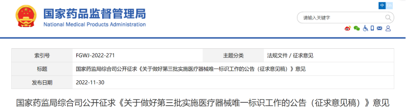 11月30日,國(guó)家藥監(jiān)局綜合司發(fā)布《關(guān)于做好第三批實(shí)施醫(yī)療器械唯一標(biāo)識(shí)工作的公告(征求意見(jiàn)稿)》(以下簡(jiǎn)稱《征求意見(jiàn)稿》)。