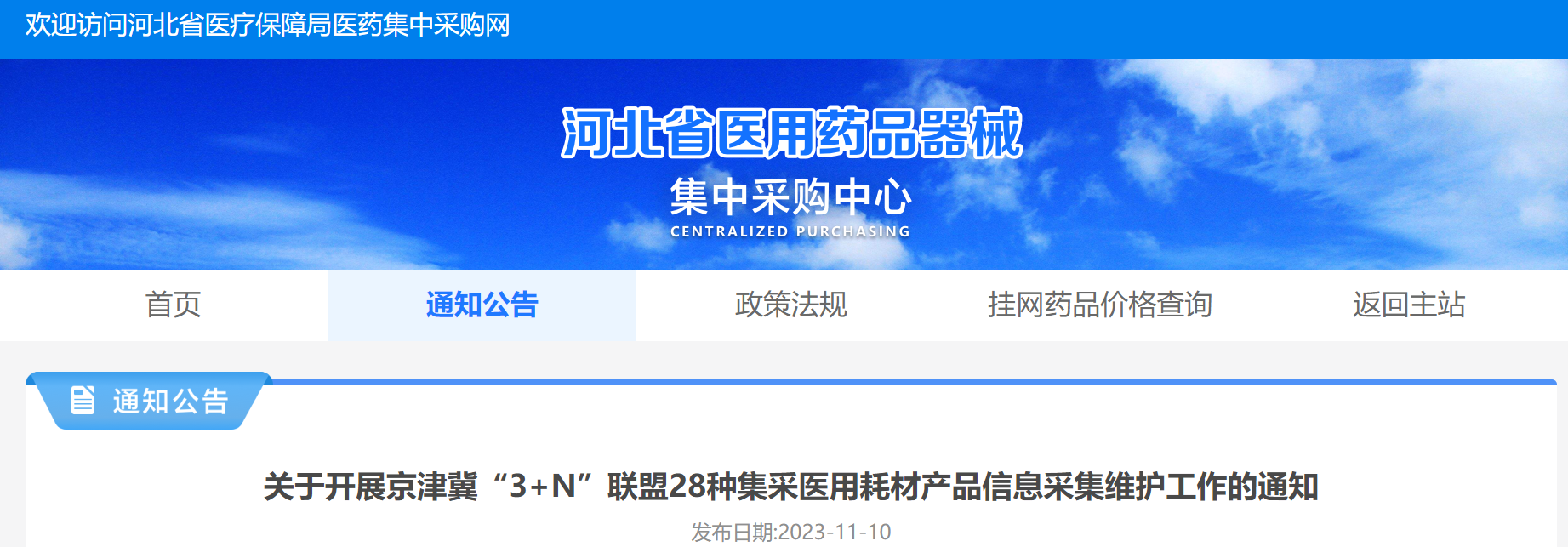 11月10日,河北省醫(yī)用藥品器械集中采購中心發(fā)布《關(guān)于開展京津冀“3+N”聯(lián)盟28種集采醫(yī)用耗材產(chǎn)品信息采集維護工作的通知》(簡稱《通知》)。