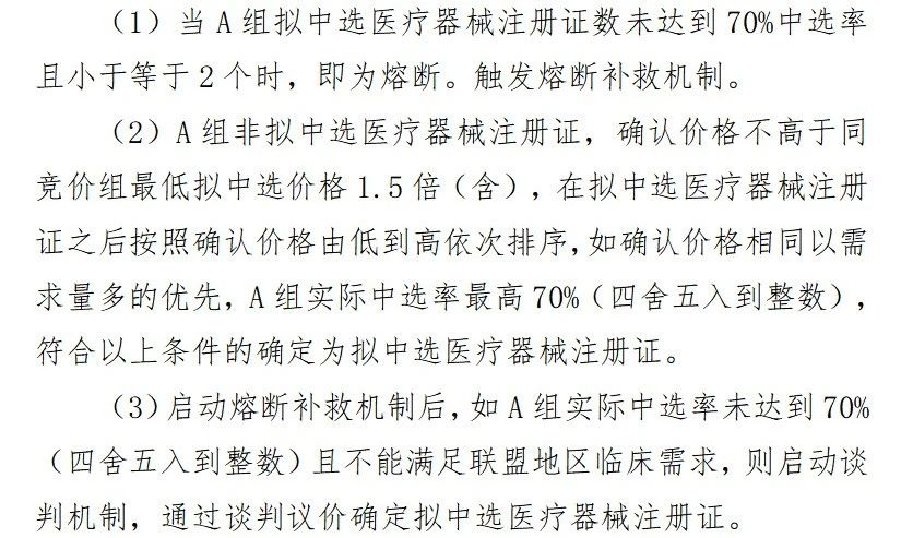 同時,當(dāng)產(chǎn)品分類為可控,且滿足A組有效申報醫(yī)療器械注冊證數(shù)量大于3個,或A組有效申報醫(yī)療器械注冊證數(shù)量為3個且擬中選醫(yī)療器械注冊證數(shù)量為1個時,則適用于熔斷機制。