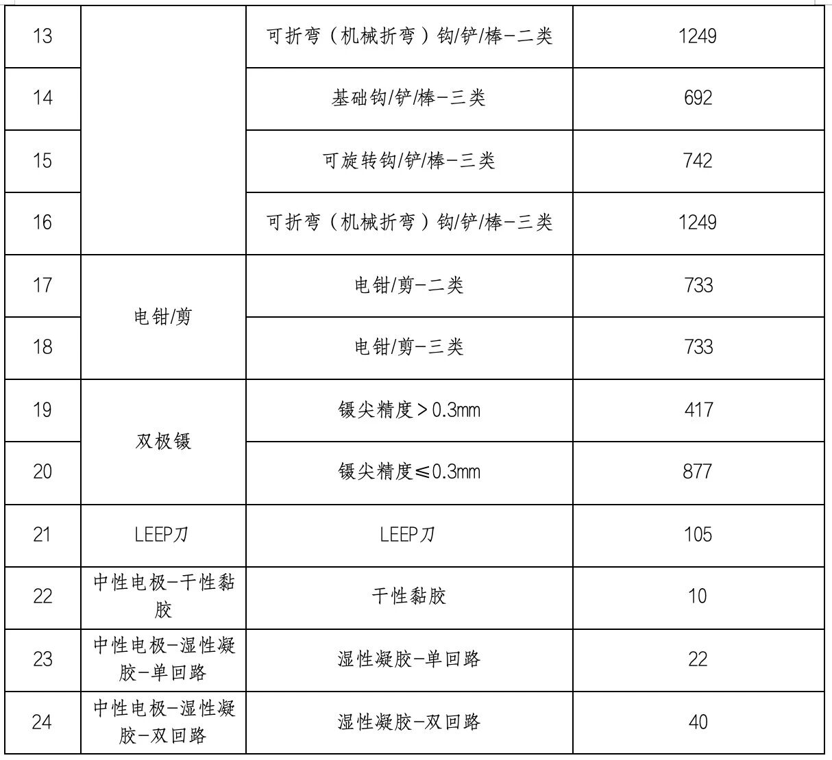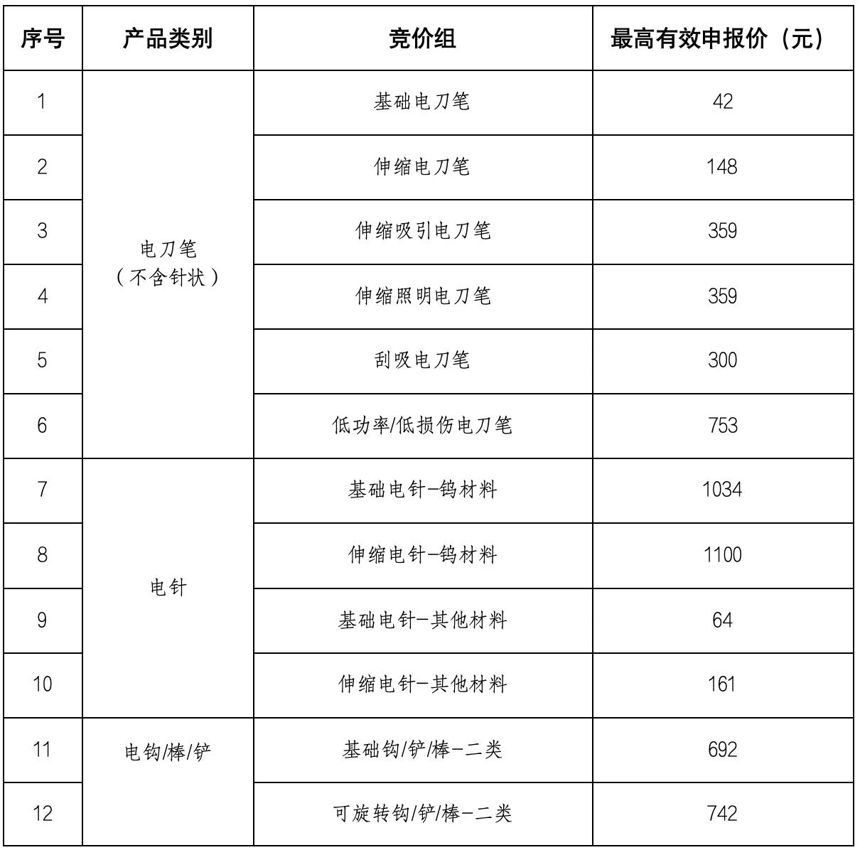 在征求意見(jiàn)稿中,基礎(chǔ)電刀筆有無(wú)涂層的最高有效申報(bào)價(jià)分別為80元和55元,在新的競(jìng)價(jià)組中統(tǒng)一定為43元;電鉗/剪從904元下調(diào)至733元;伸縮照明電刀筆從508元下調(diào)至359元。