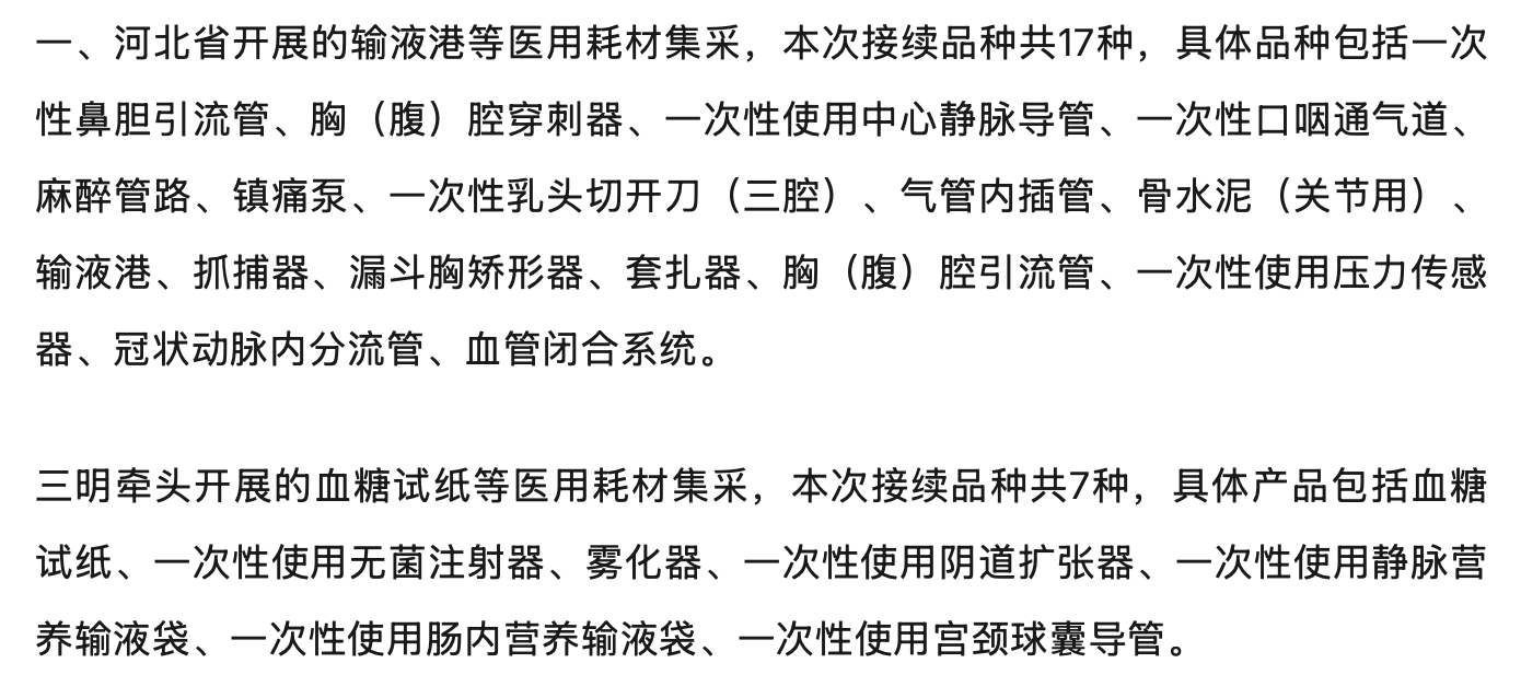 此次接續(xù)共涉及兩批醫(yī)用耗材集采項目,包括河北省輸液港等耗材集采(本次接續(xù)品種共17種)與三明牽頭的血糖試紙等耗材集采(本次接續(xù)品種共7種),具體品種如下: