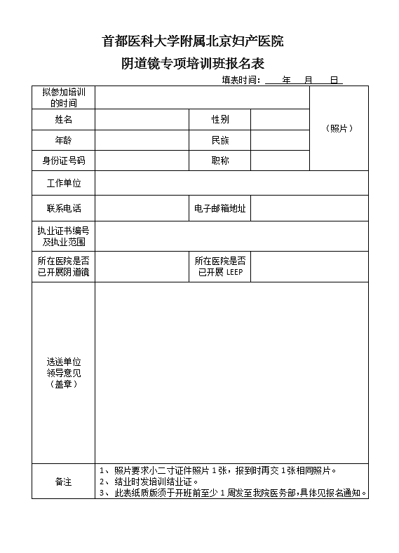 1、在北京婦產(chǎn)醫(yī)院官網(wǎng)科研教學(xué)欄目(http://www.bjogh.com.cn/kj/jj/)下載我院陰道鏡專項培訓(xùn)班報名表,開班前至少1周,按要求填好后郵寄北京婦產(chǎn)醫(yī)院醫(yī)務(wù)部,郵寄地址:北京市朝陽區(qū)姚家園路251號北京婦產(chǎn)醫(yī)院(東院)培訓(xùn)樓107室醫(yī)務(wù)部(郵編100026)。