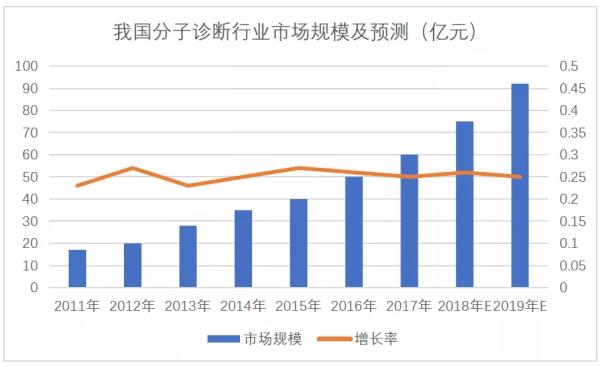 火石創(chuàng)造統(tǒng)計(jì)數(shù)據(jù):近年全球分子診斷行業(yè)年均增速約為11%,而我國(guó)分子診斷行業(yè)年均增速則達(dá)到了24%,為全球增速的兩倍。預(yù)計(jì)到2019年,我國(guó)分子診斷市場(chǎng)規(guī)模將有望超過 90 億元。