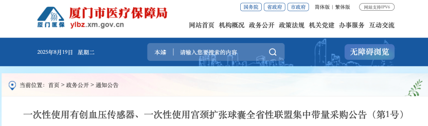 8月18日-8月19日,福建漳州、廈門醫(yī)保局分別發(fā)布《一次性使用壓力延長管、注射器全省性聯(lián)盟集中帶量采購公告(第1號)》《一次性使用有創(chuàng)血壓傳感器、一次性使用宮頸擴張球囊全省性聯(lián)盟集中帶量采購公告(第1號)》。