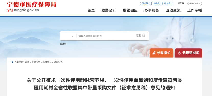 此外,福建寧德醫(yī)保局發(fā)布《關于公開征求一次性使用靜脈營養(yǎng)袋、一次性使用血氧飽和度傳感器兩類醫(yī)用耗材全省性聯(lián)盟集中帶量采購文件(征求意見稿)意見的通知》